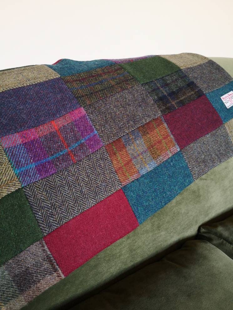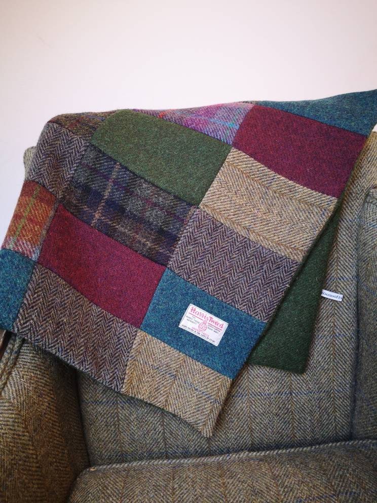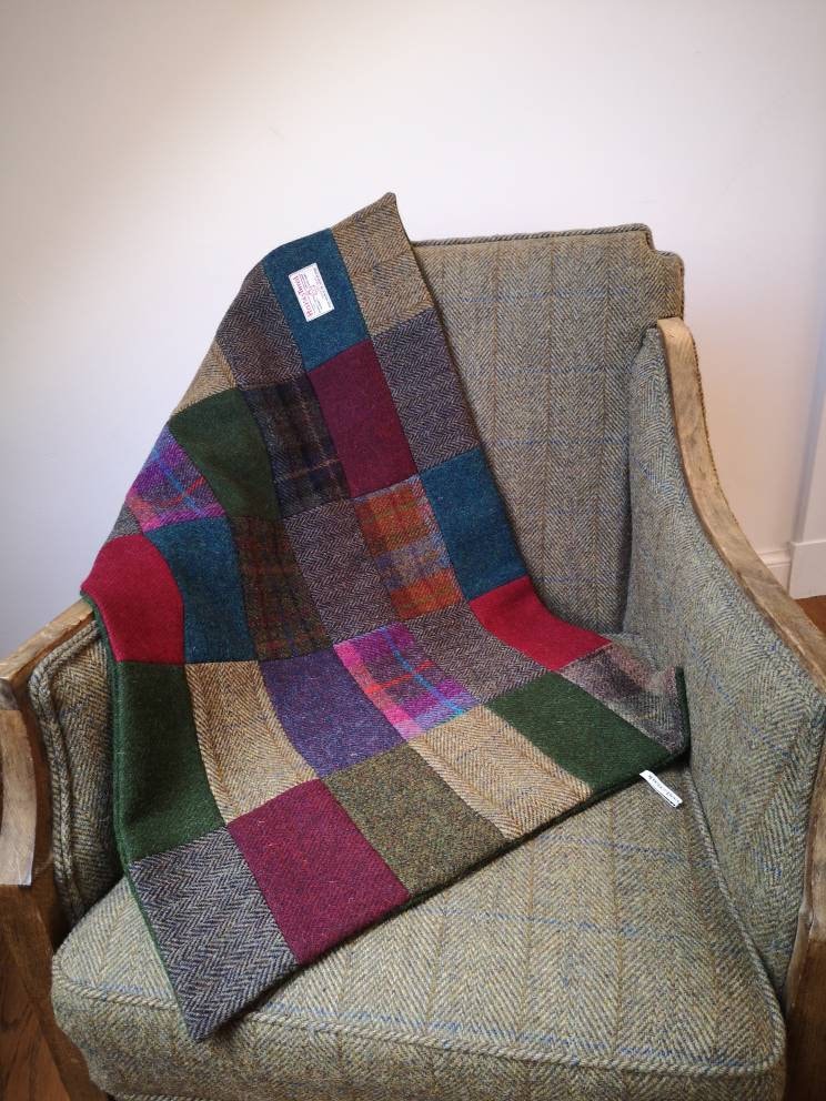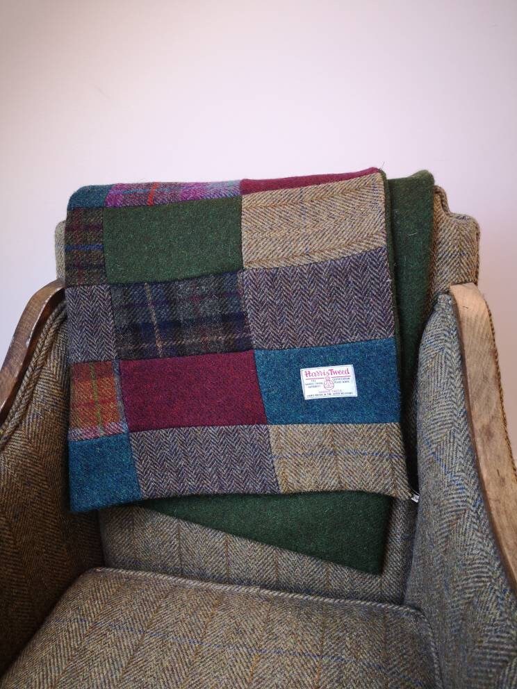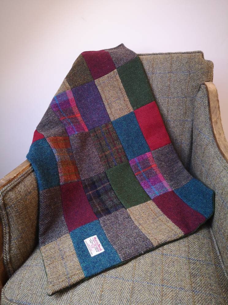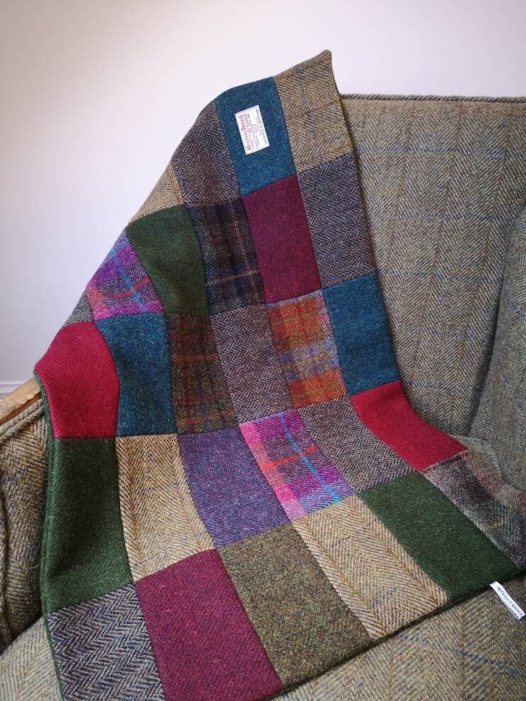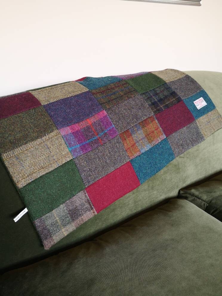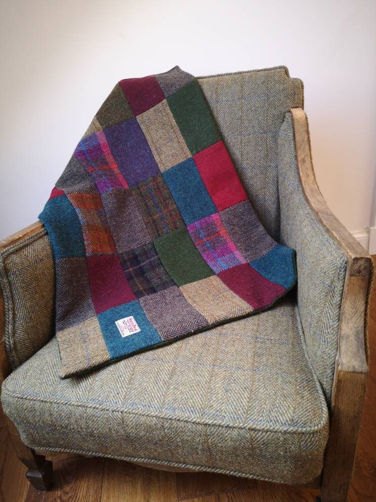Hand crafted rustic patchwork Harris Tweed rug, blanket. Fully reversible.