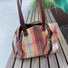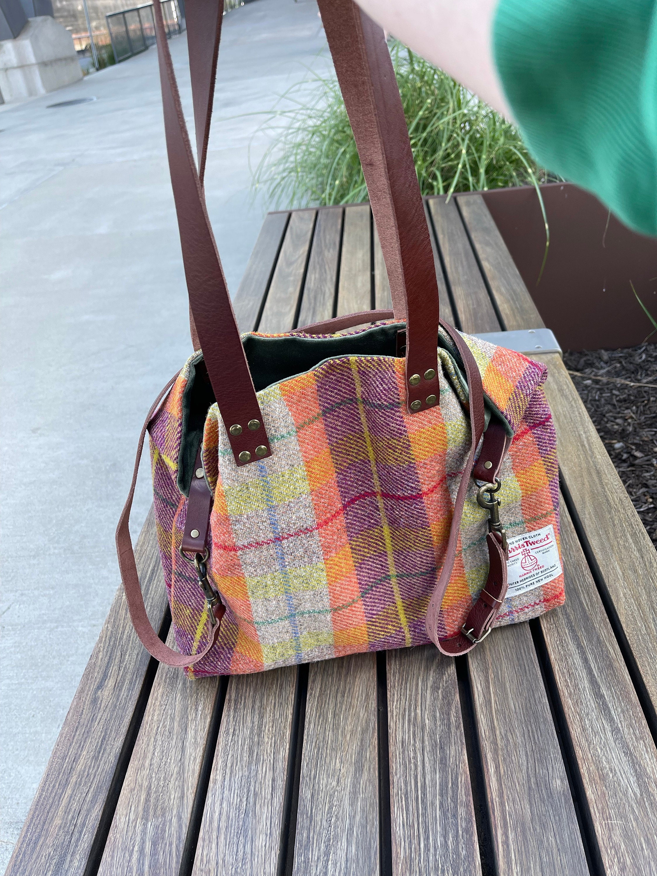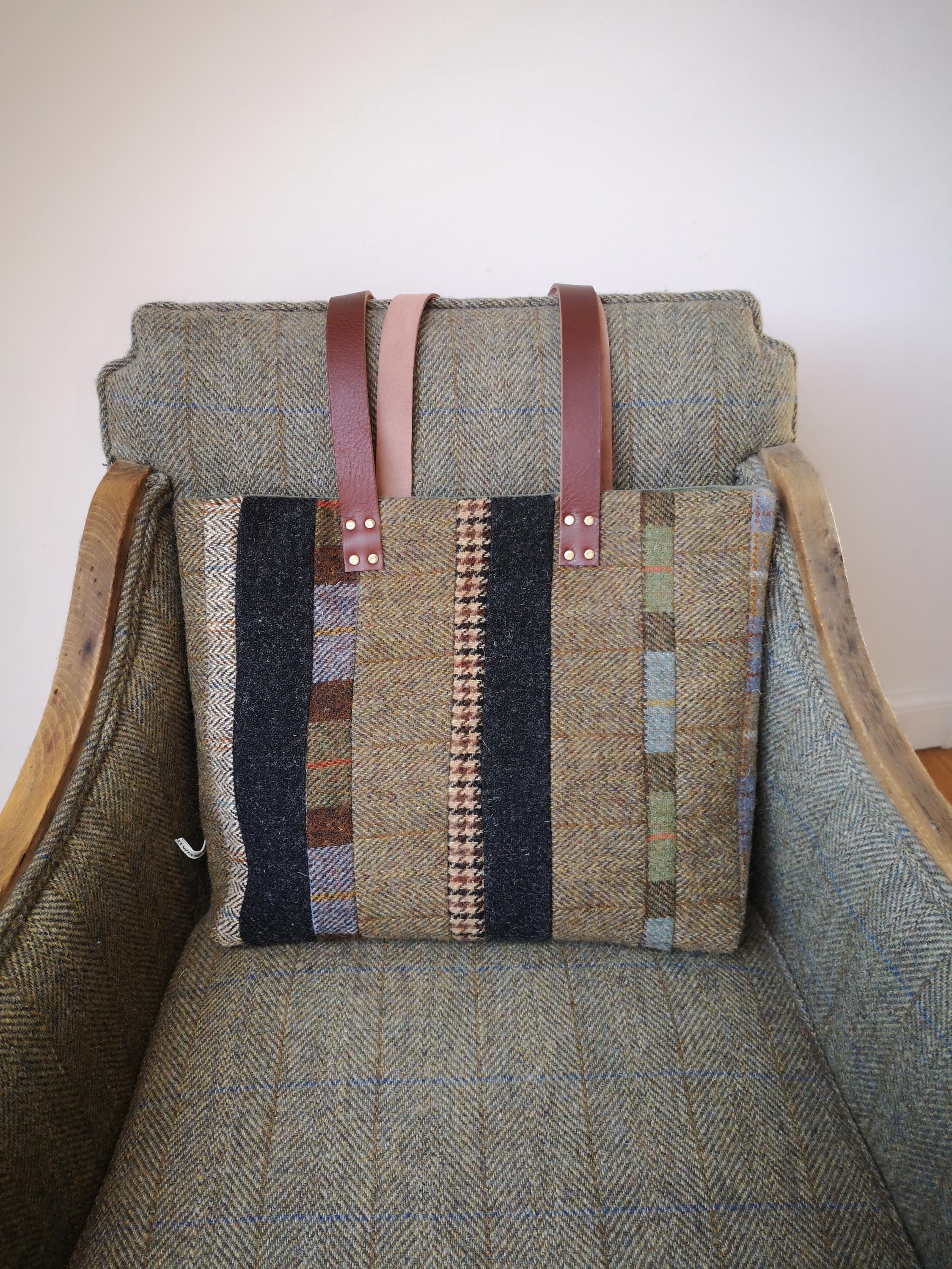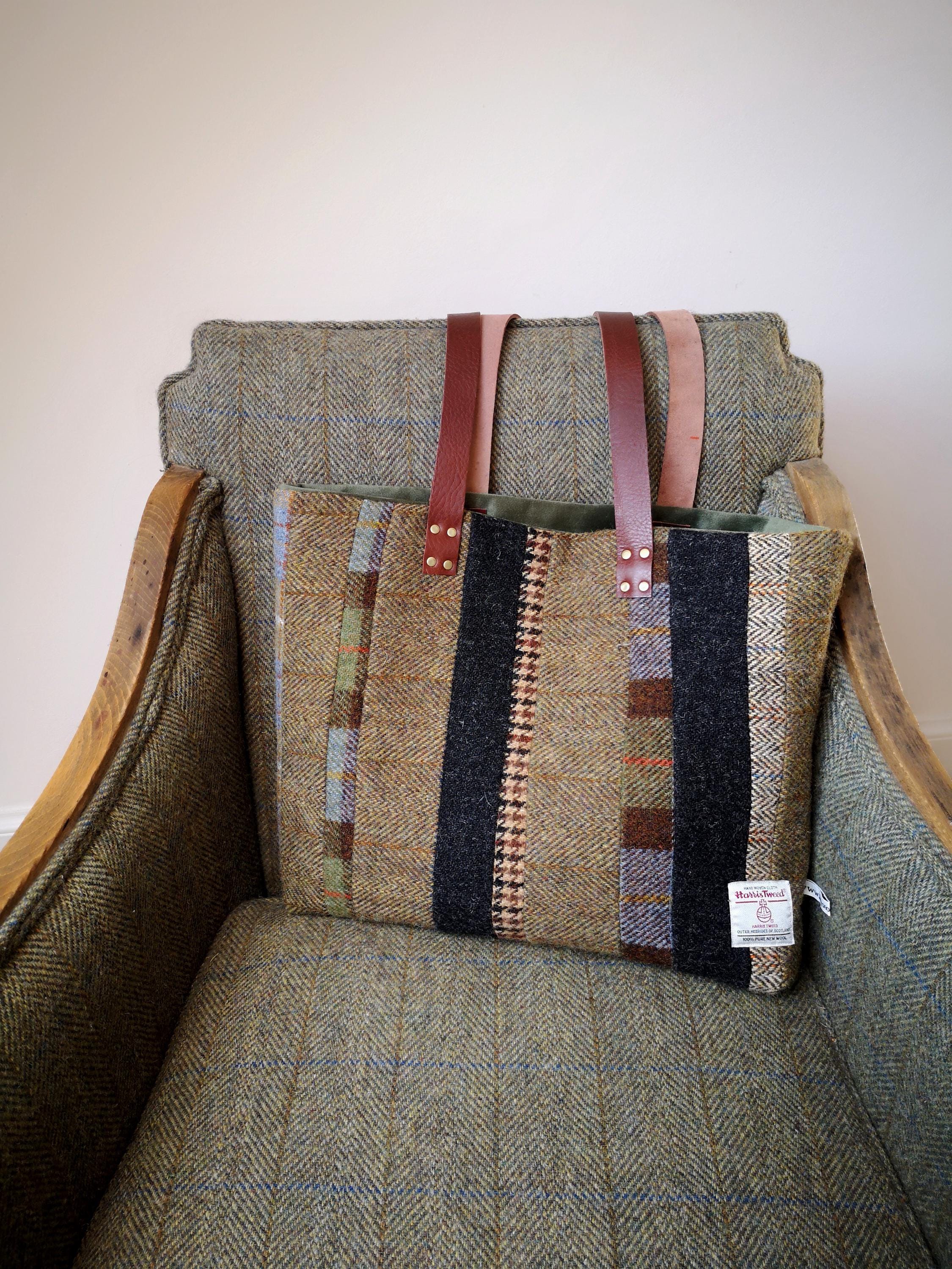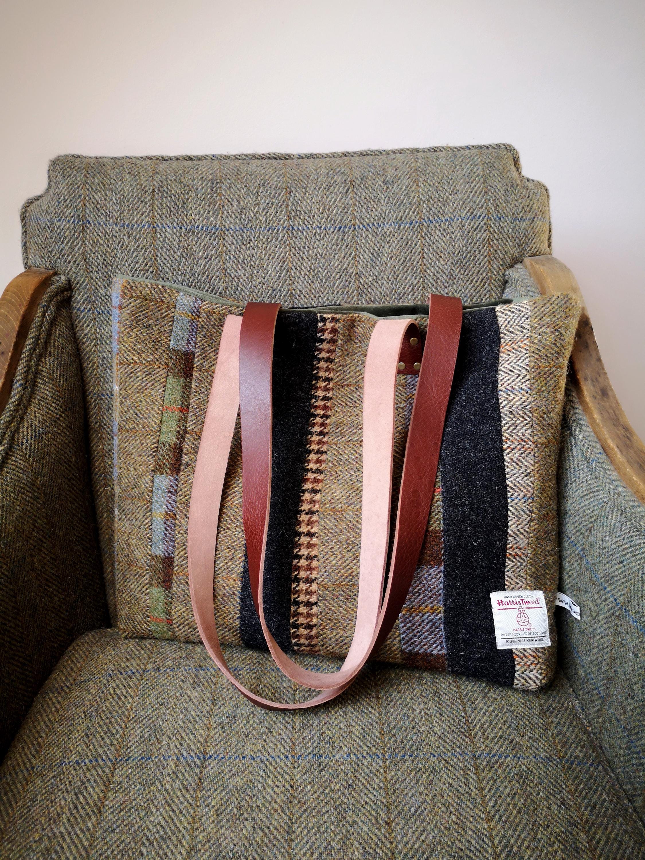 Beautifully handcrafted Harris Tweed bag with real leather straps measuring approximately 30 inches.