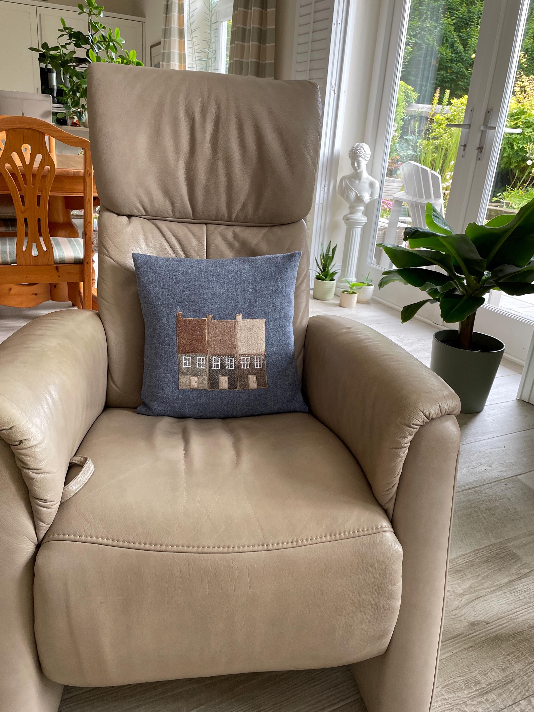 The houses were hand drawn and cut out of Harris Tweed and embroidered onto the cushion.