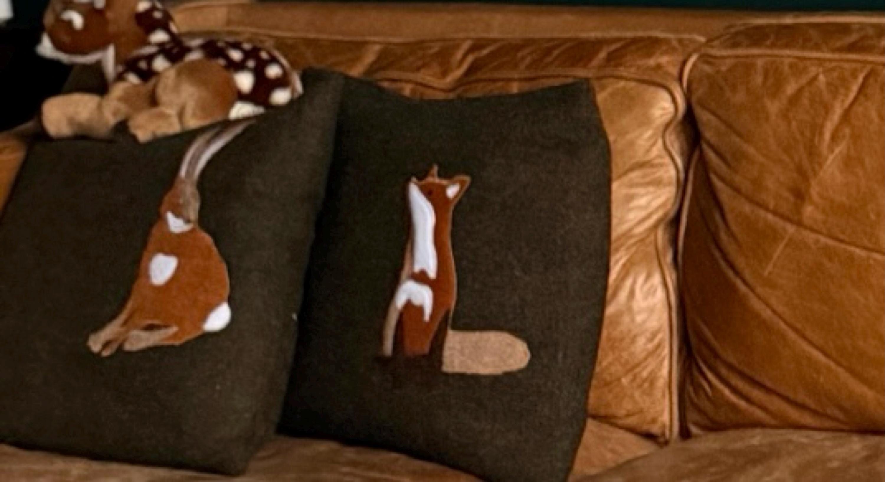 The hare is hand drawn and cut from wool and felt and embroidered onto the cushion.