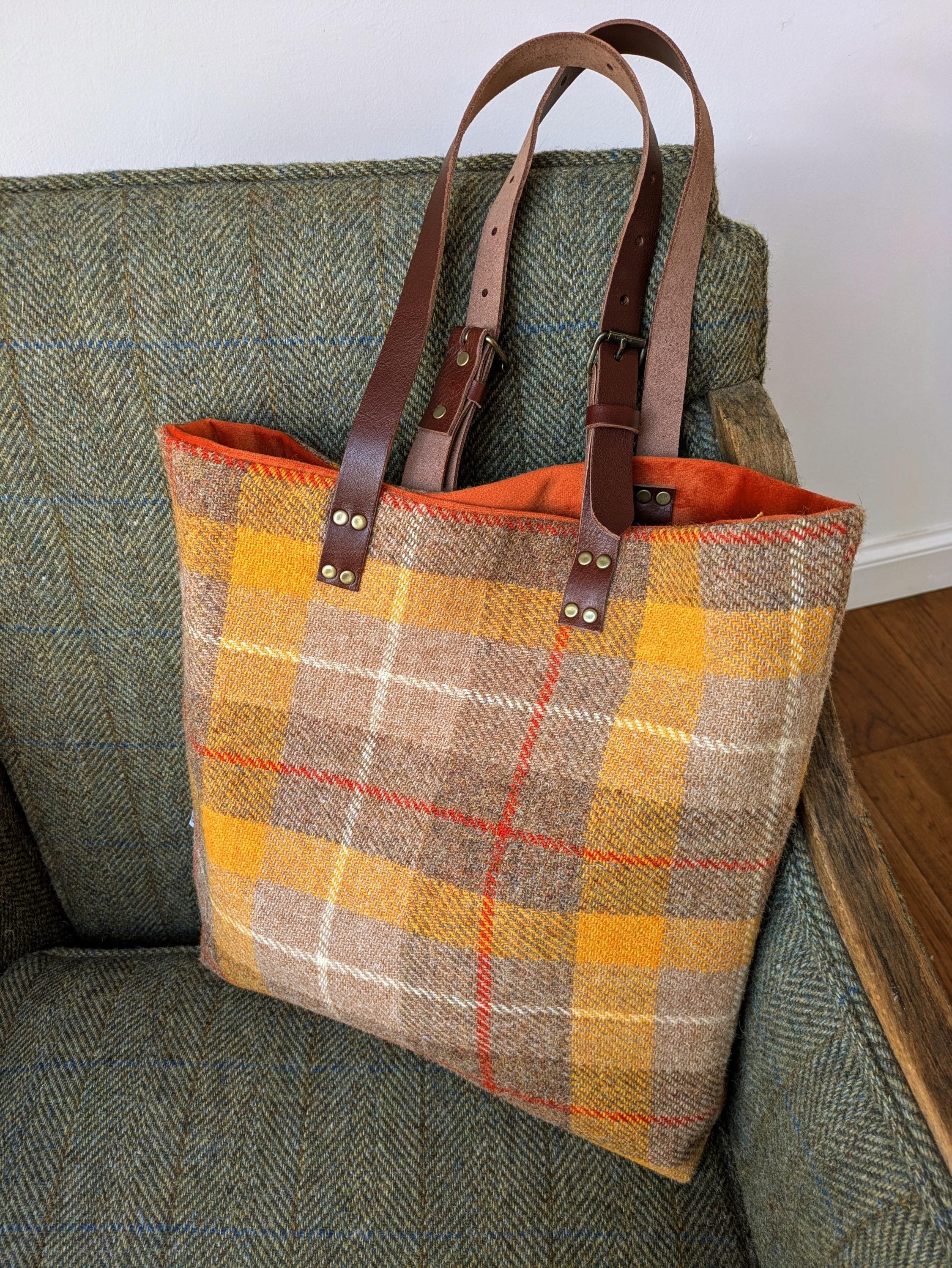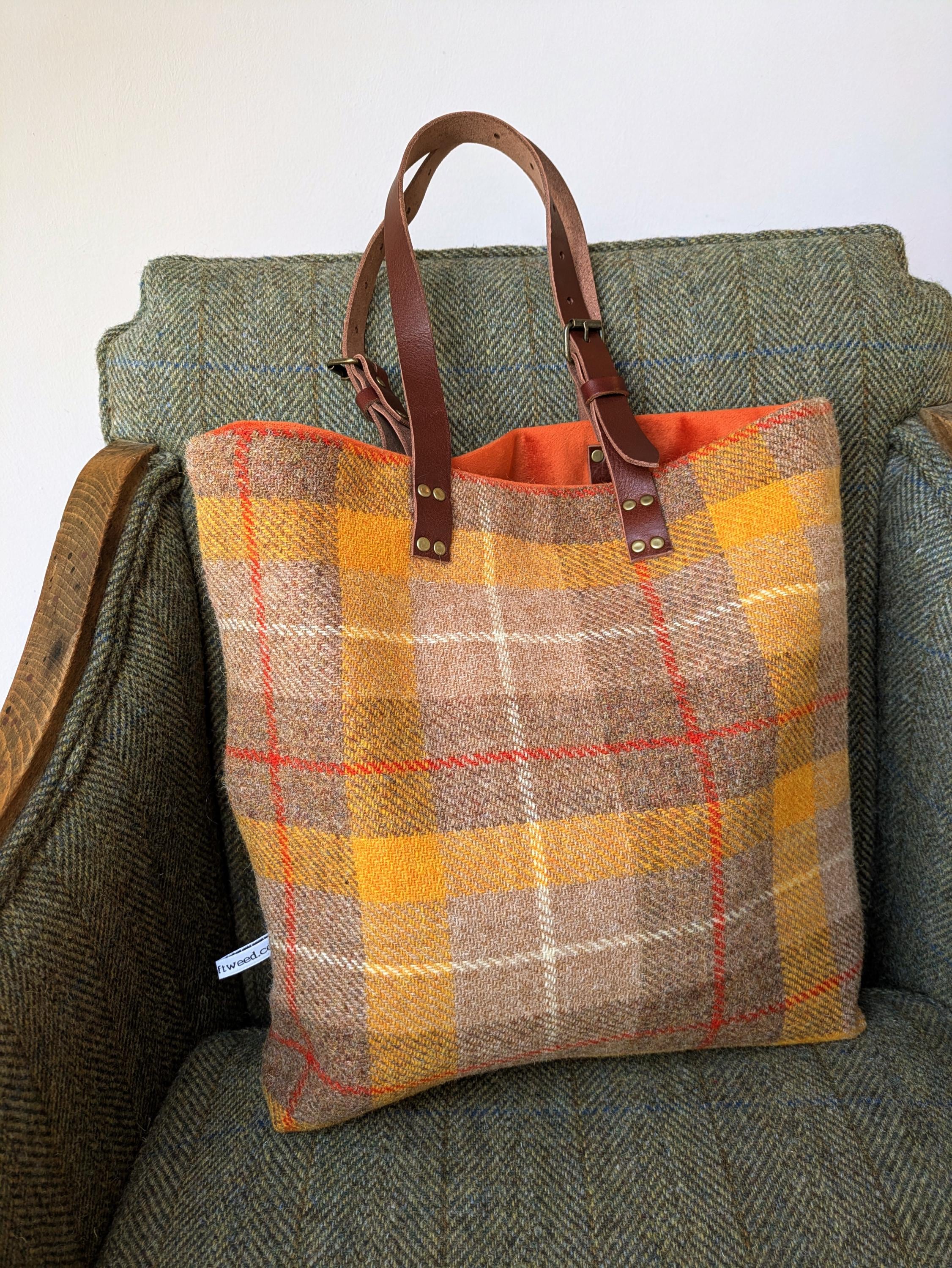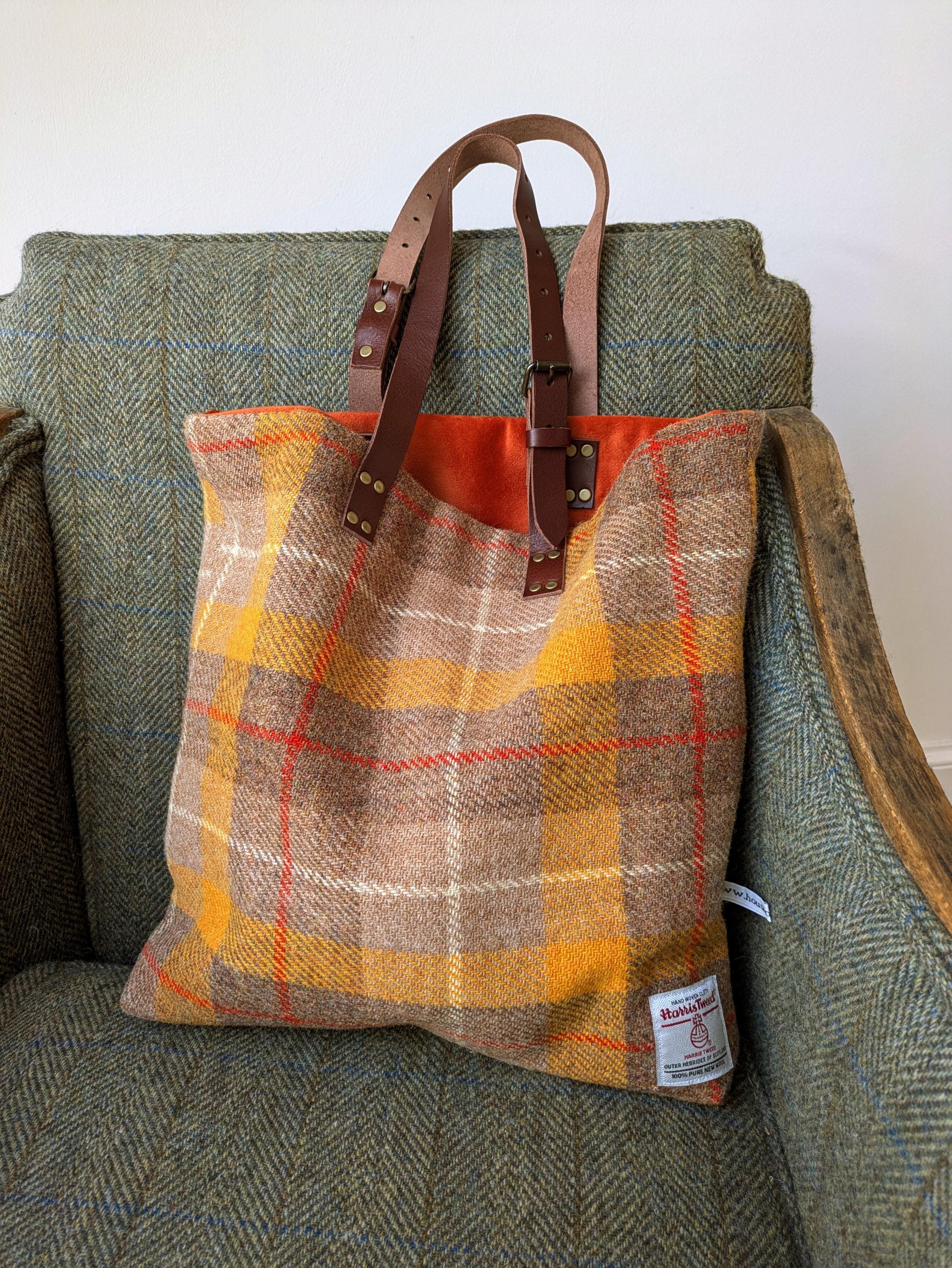Beautifully handcrafted bag in orange check Harris Tweed.