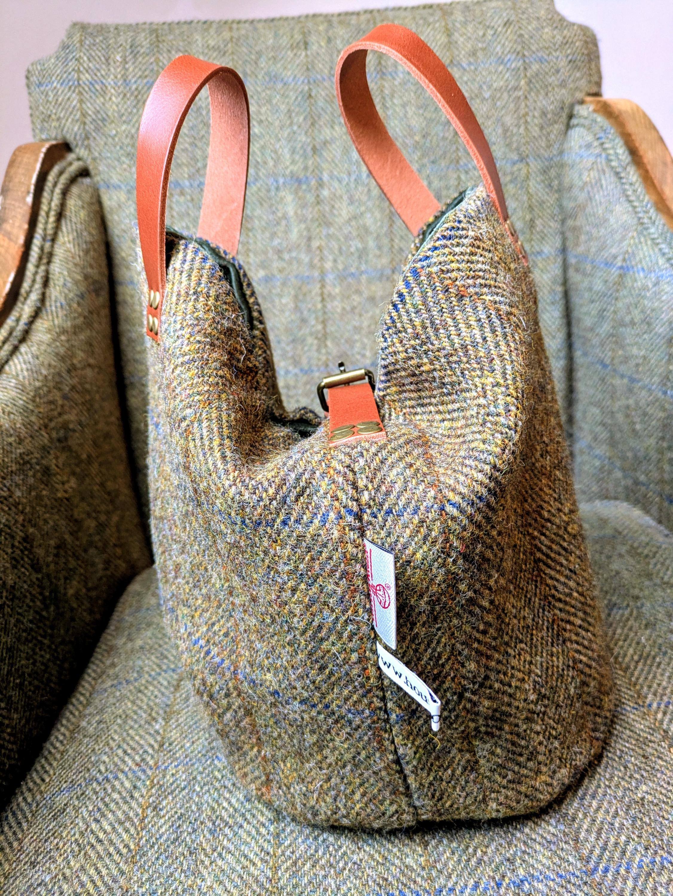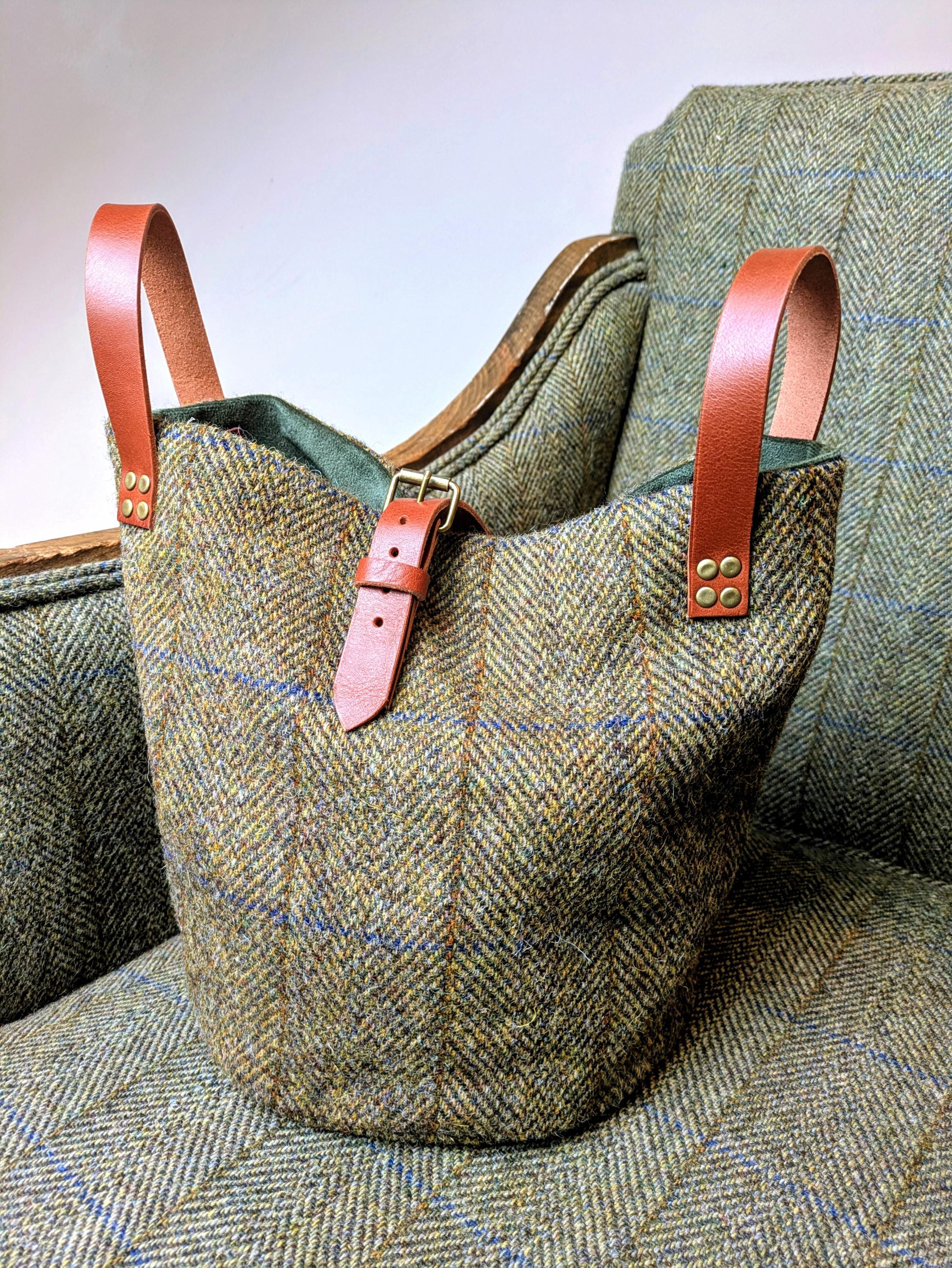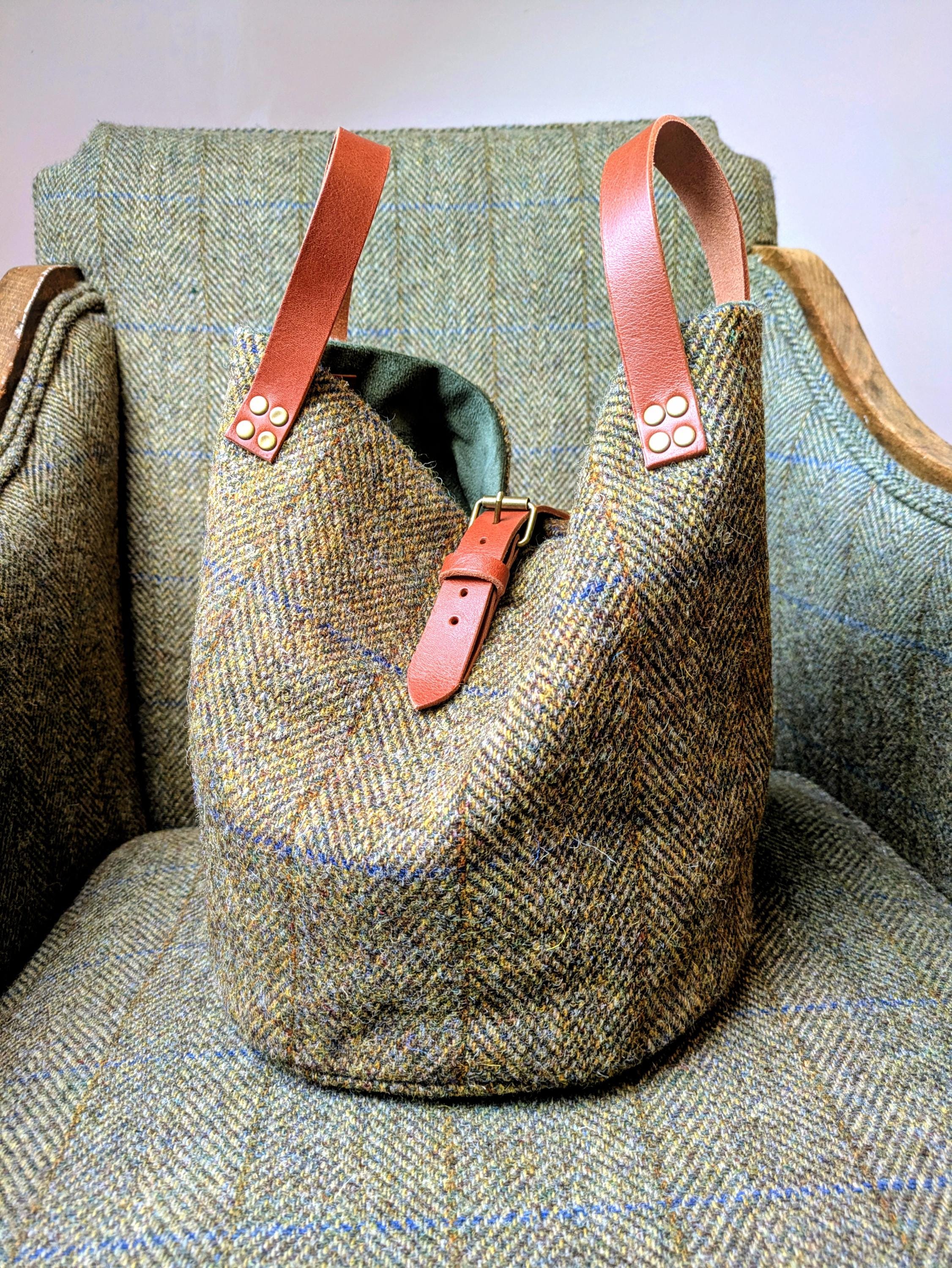 Beautifully handcrafted bag in olive herringbone Harris Tweed.