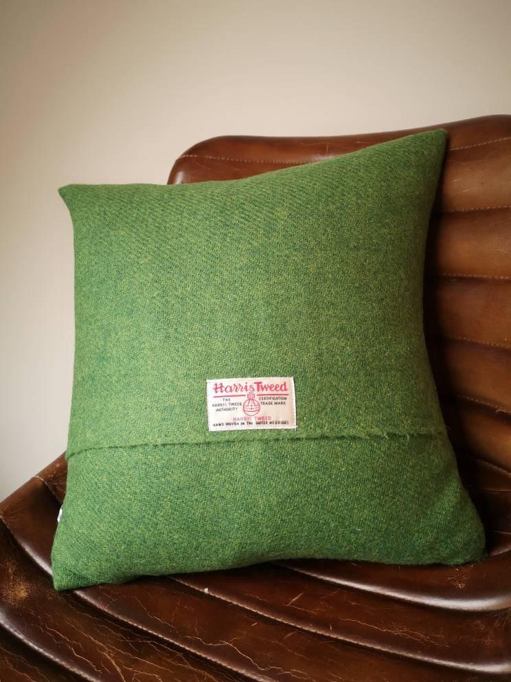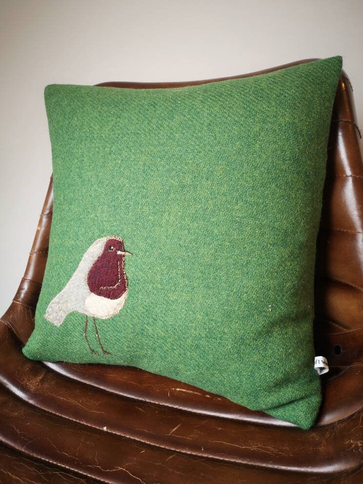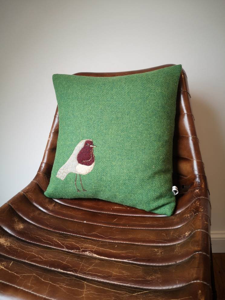 Hand crafted Robin cushion cover made with bright green Harris Tweed.