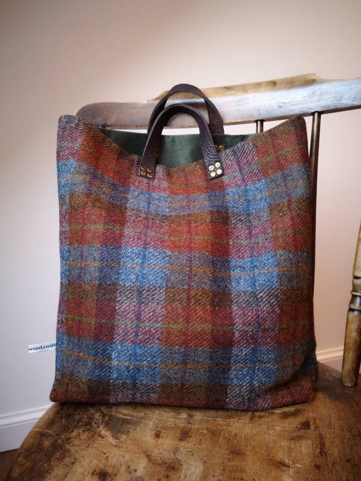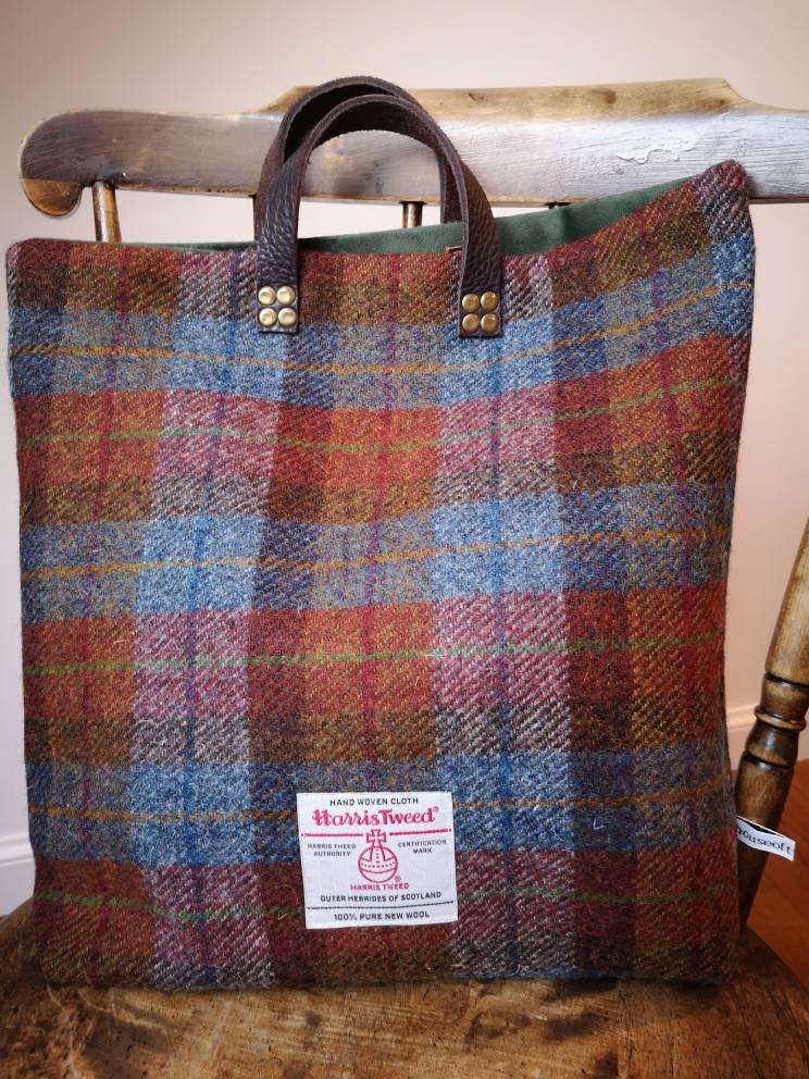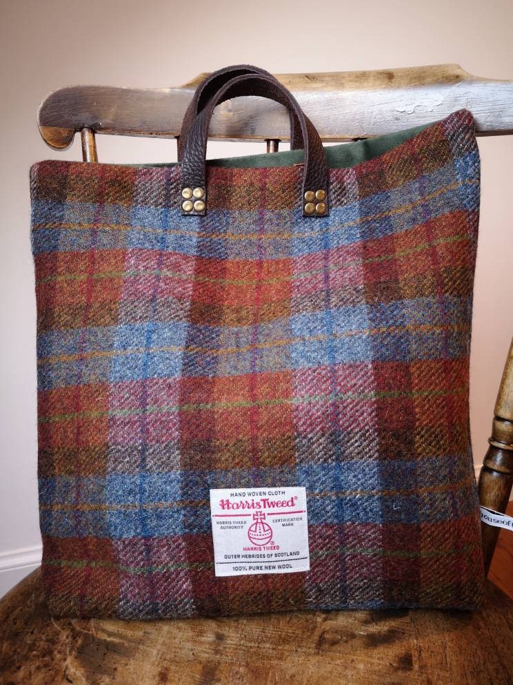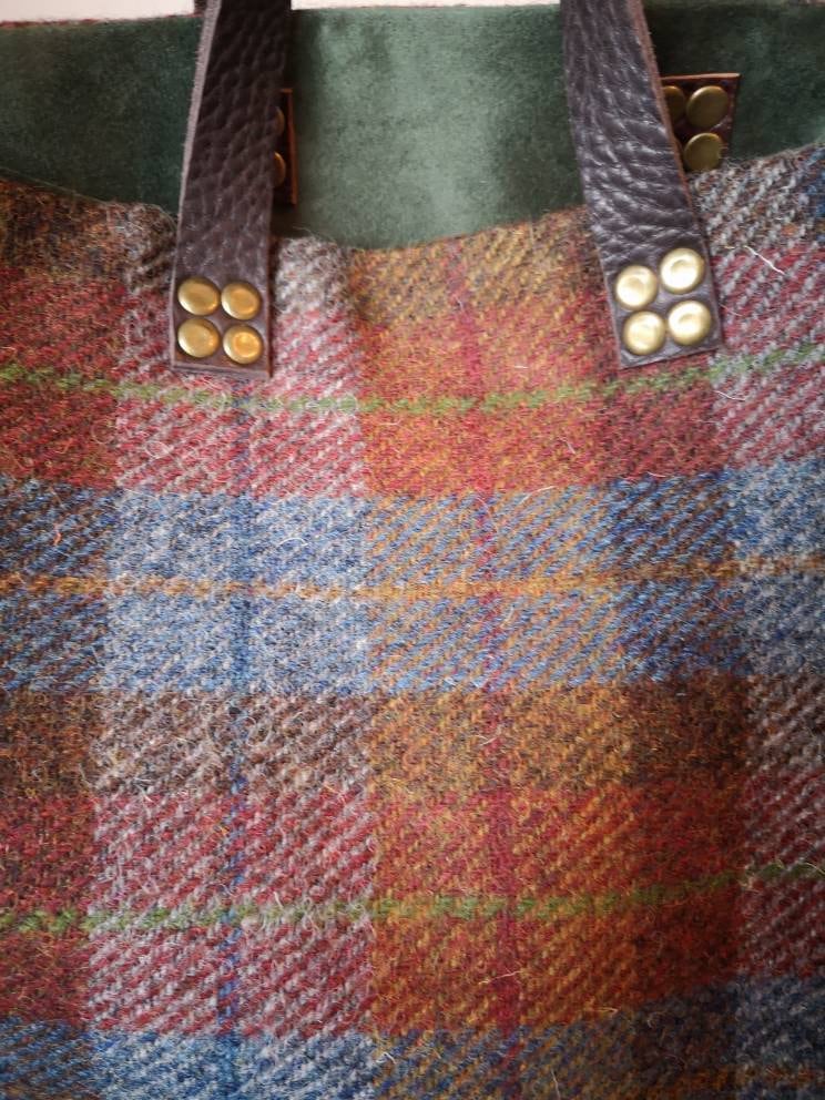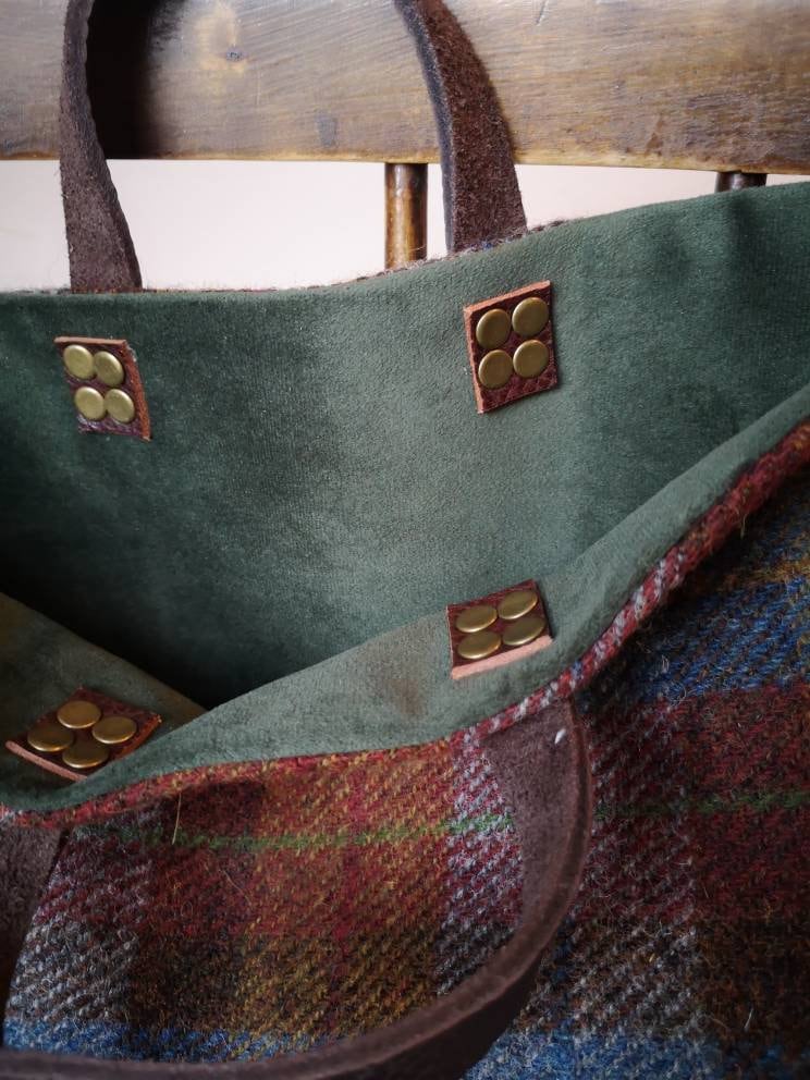 Beautifully handcrafted Harris Tweed bag with real leather handles secured with brass rivets.