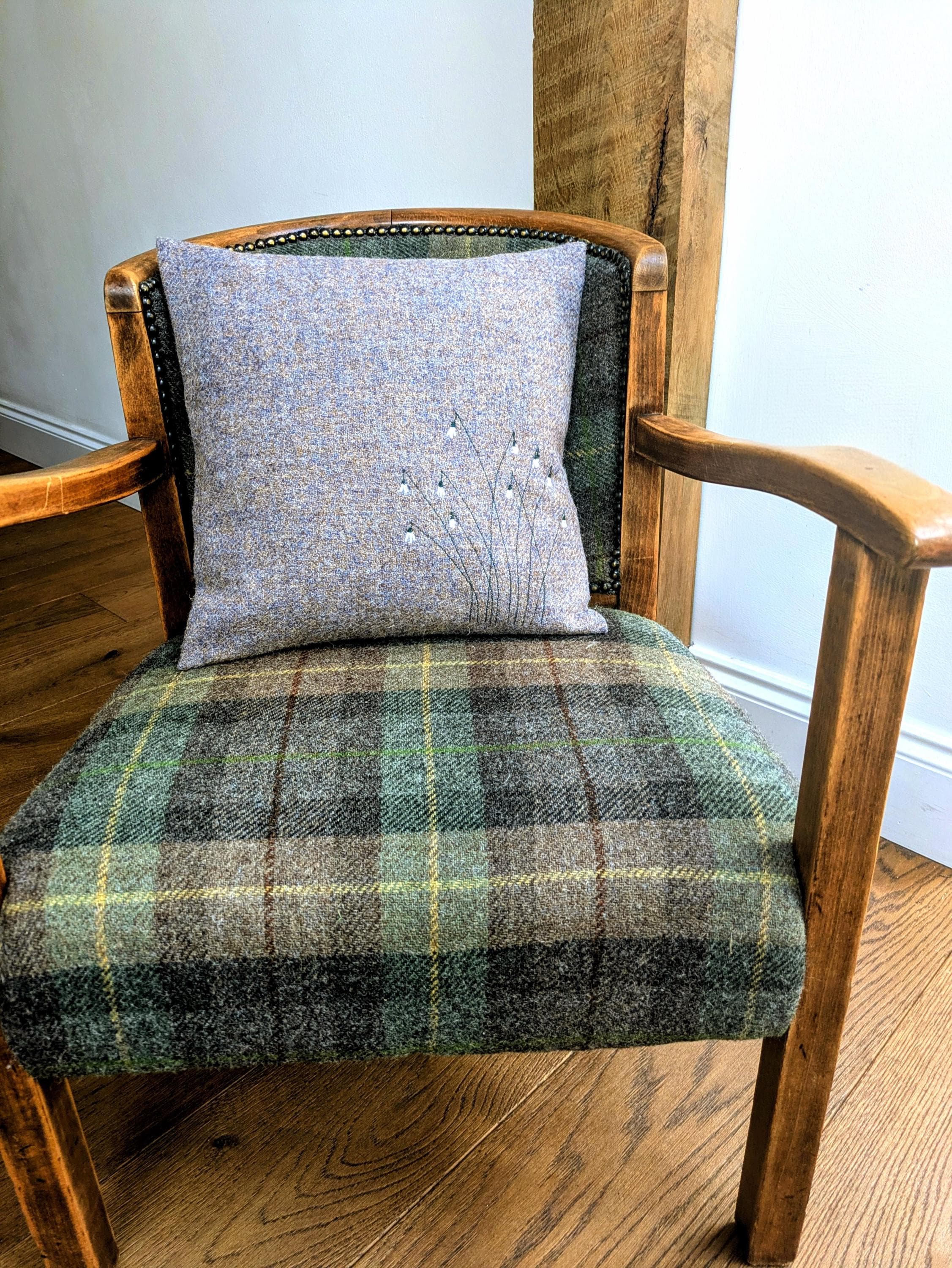Hand Crafted snow drops embroidered cushion cover made with Harris Tweed.